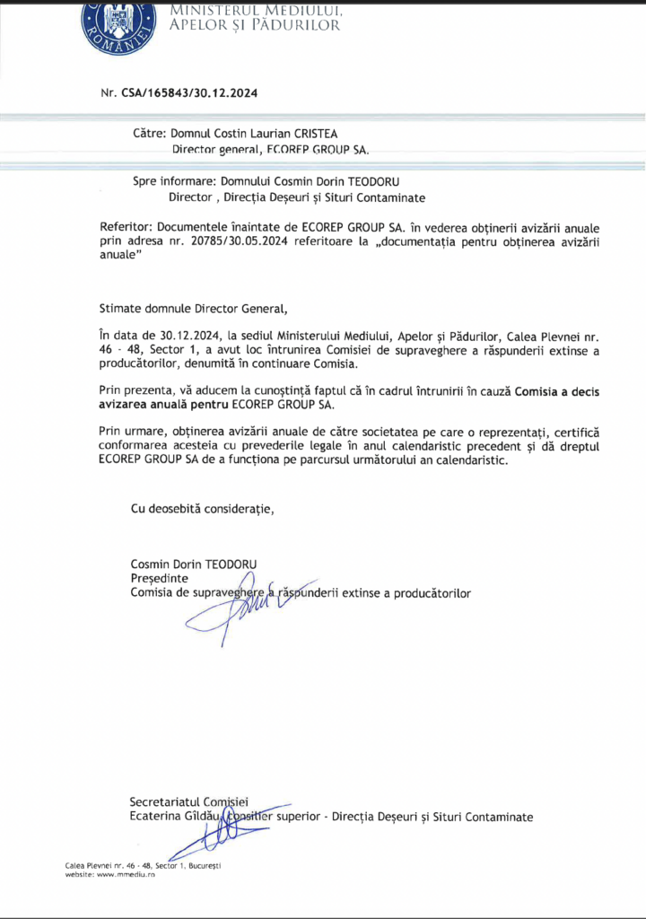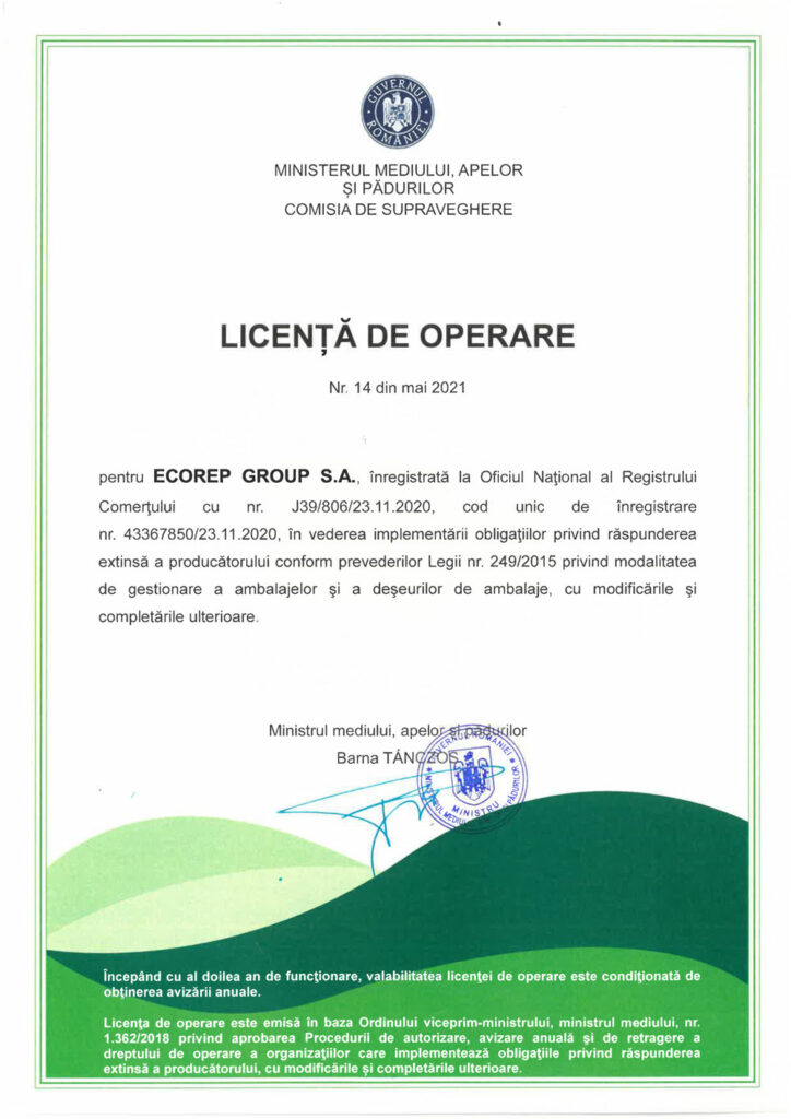ECOREP GROUP S.A. este o organizație ce implementează răspunderea extinsă a producătorilor (OIREP) autorizată de Ministerul Mediului Apelor și Pădurilor în baza Licenței de Operare Nr. 14 din mai 2021.